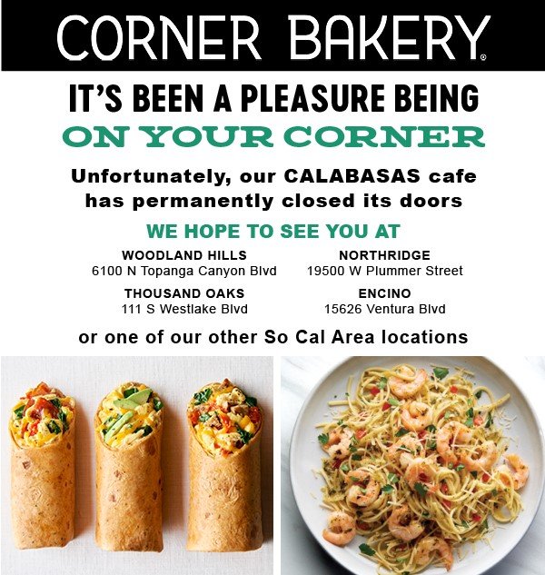 Corner Bakery, after a long run at The Commons at Calabasas, has closed its doors. The Thousand Oaks location at 111 S. Westlake Boulevard is still open. cornerbakerycafe.com
