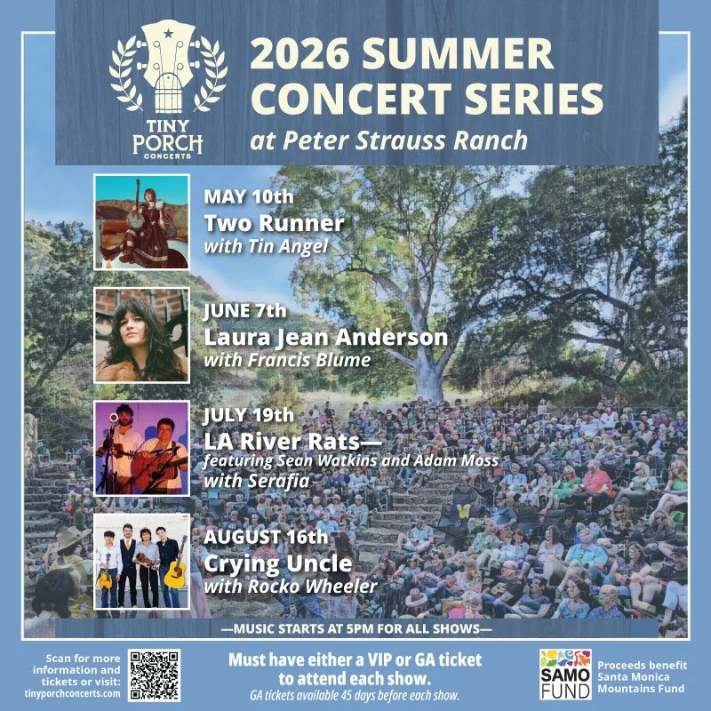 Tiny Porch Concerts is a non-profit 501(c)3 organization dedicated to the arts and preserving the Santa Monica Mountains. Net proceeds for each show go to the artists and the Santa Monica Mountains Fund which contributes directly to the local National Parks.