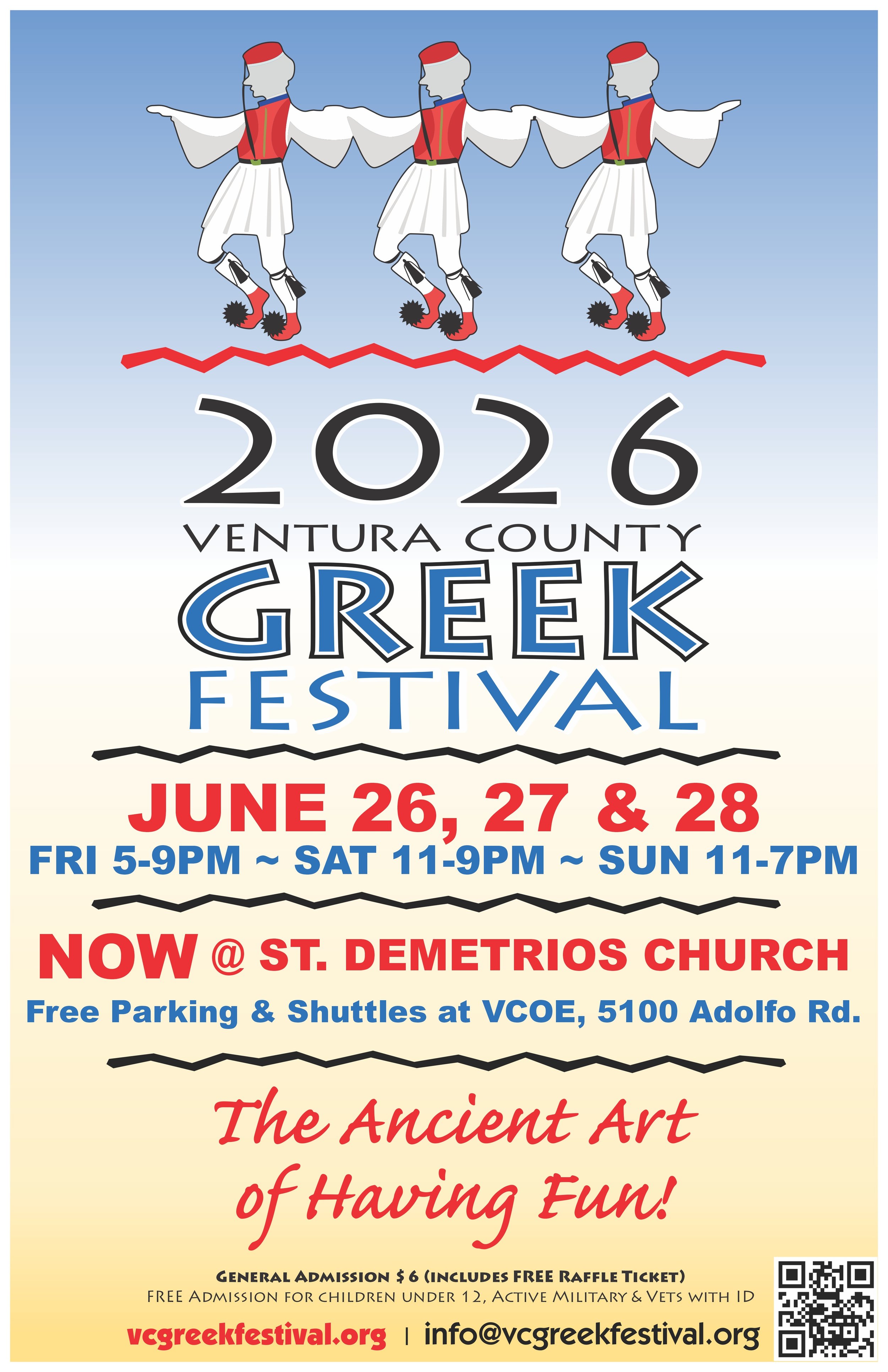 Check vcgreekfestival.org or call 805.482.1273 for more information. No onsite parking. Free parking and shuttle rides at the Ventura County Office of Education parking lot at 5100 Adolfo Road.