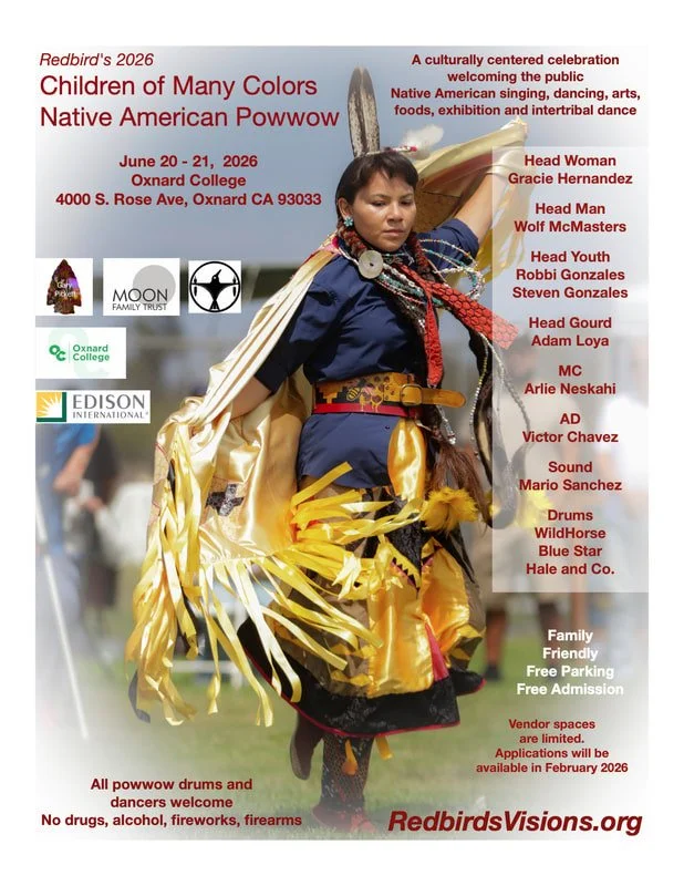 Please no drugs, alcohol, smoking, vaping, fireworks or firearms.  Free parking and free admission.  The powwow is hosted by Redbird, a 501(c)(3) non profit association, and sponsored by Edison International, The Moon Family Trust, Gary Pickett, Oxnard College, and the County of Ventura Department of Arts and Culture.